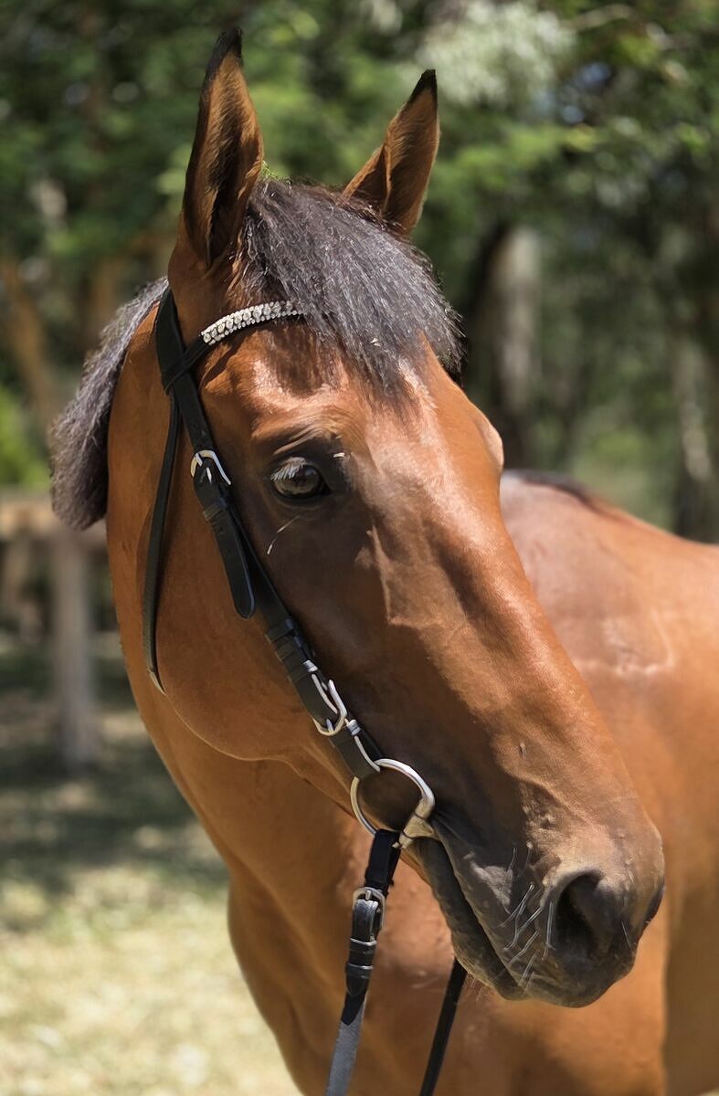 Piper (of Hamelin) is a 5-year-old OTTB gelding by Oratorio, standing approximately 16.1 hh, with a compact, stocky build and a soft, kind expression. He was originally purchased as a prospect for Western mounted games and has the athletic, sturdy type to suit a variety of disciplines.